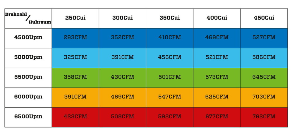 Die folgende Tabelle ist für modifizierte Motoren mit 90% volumetrischen Wirkungsgrad