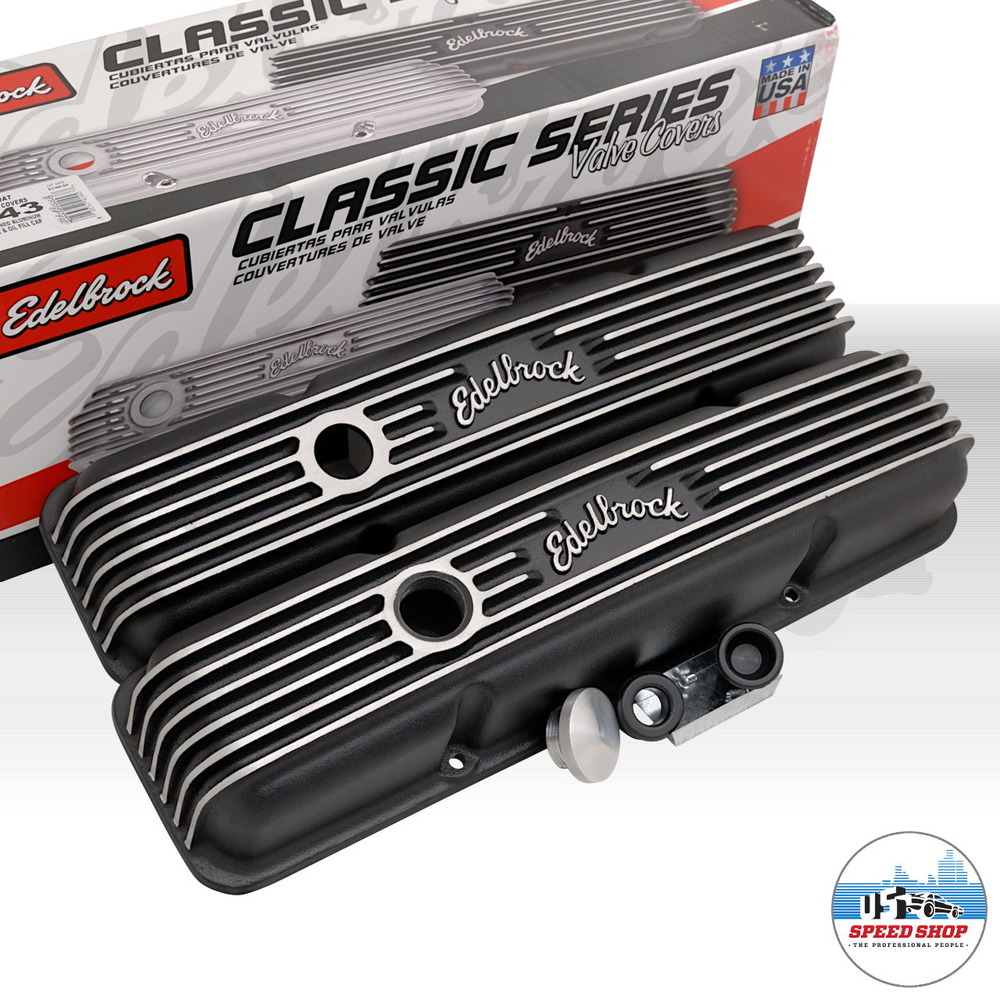 Diese Ventildeckel sind eine Wiederauflage der ersten Aluminiumventildeckel von Edelbrock aus den späten 1950 Jahren. Sie sind schwarz Pulverbeschichtet mit gebürsteten Rippen und "Edelbrock" Schriftzug. Ein Deckel verfügt über eine 1-1/4"(32mm) Bohrung zur Aufnahme eines Entlüfter, der andere besitzt ein Gewinde zur Aufnahme des mitgelieferten Ölverschlussdeckel's. Dank ihrer hohen Ausführung von 3.58"(91mm) bieten diese Ventildeckel genügend Platz auch für einen veränderten Ventiltrieb. Weiter liefert Edelbrock ein optional verwendbares Ölleitblech mit, um einen ungewollten Ölaustritt durch den Entlüfter zu verhindern.