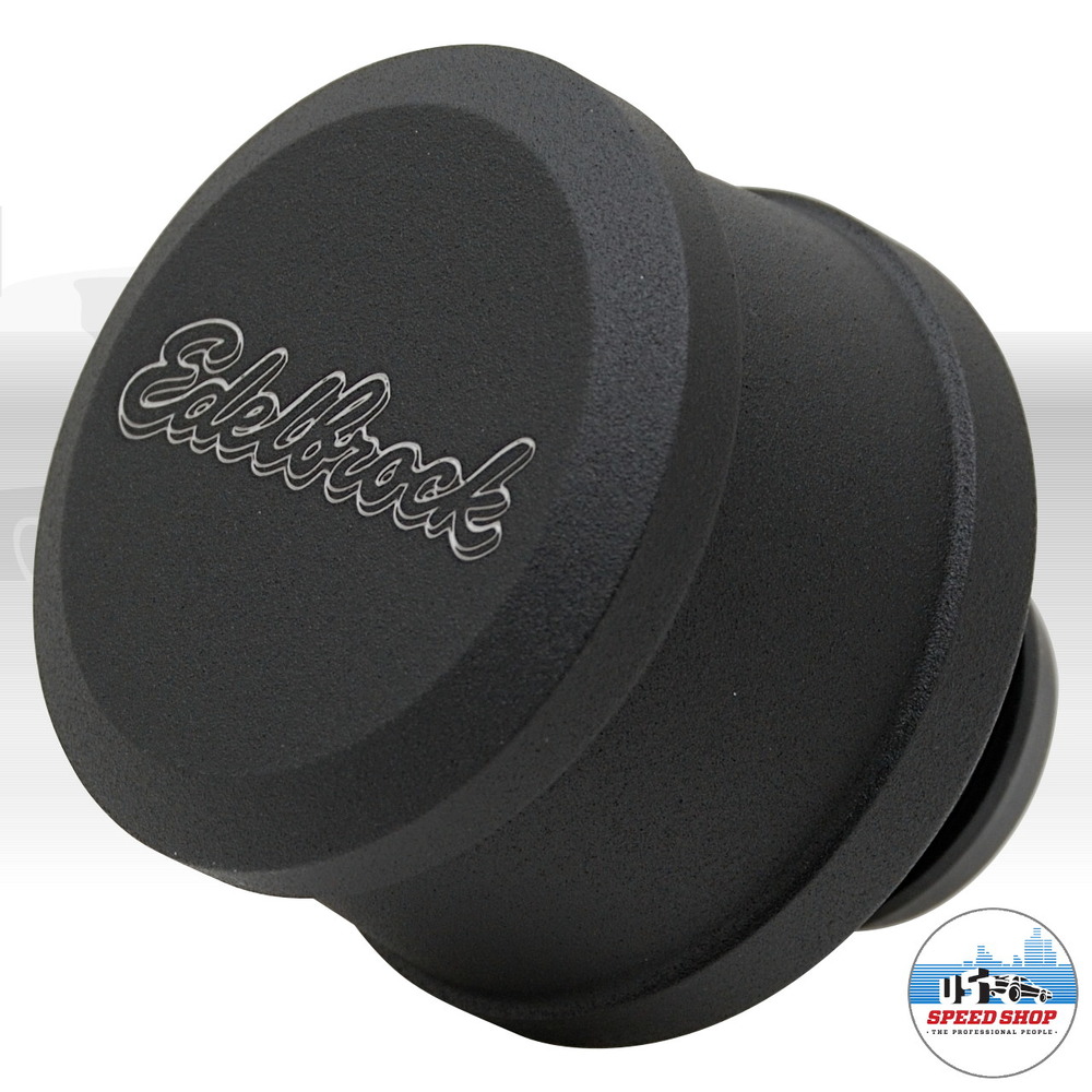 Edelbrock push-in breather cap - Schwarze Kurbelwellengehäuseentlüftung aus Aluminium mit 25,4mm (1") Flansch